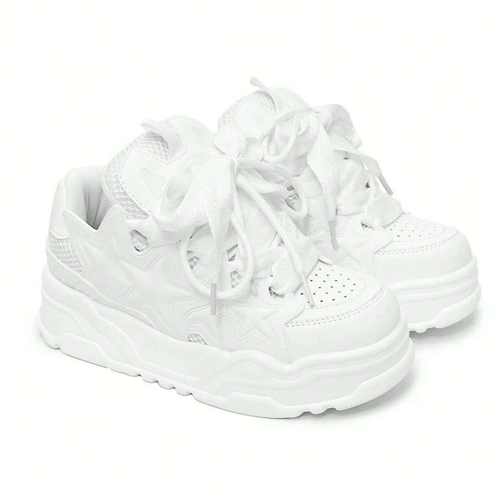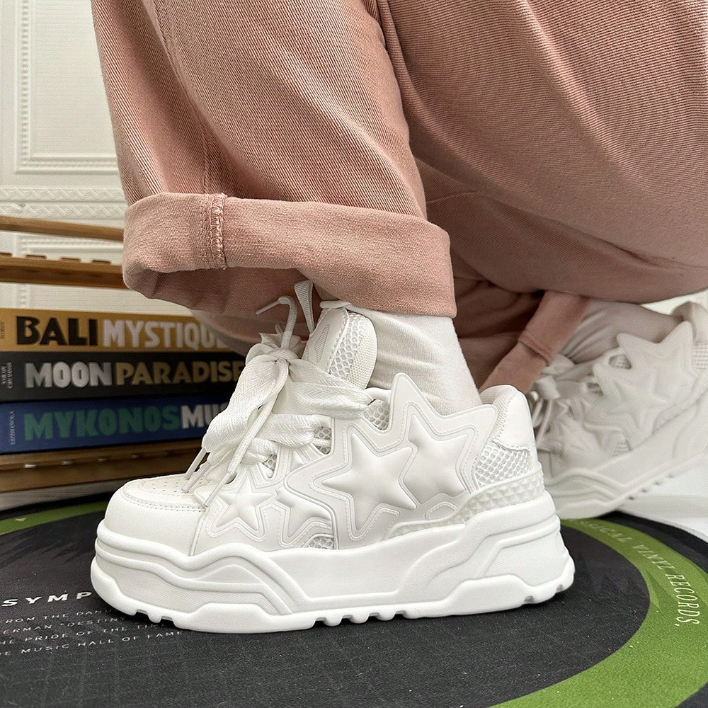 Experience the perfect mix of comfort and high fashion. These all-white chunky sneakers stand out with unique star overlays and eye-catching wide-ribbon lacing. The lightweight, shock-absorbing platform provides effortless height without the weight, while the padded collar offers superior ankle support. Whether you’re shopping with friends or heading to a concert, these kicks are built to turn heads and keep you comfortable.